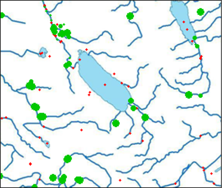 Die Datenerhebung erfolgt in der MS Access basierten Applikation. Die erfassten Datenkönnen georeferenziert ausgewertet werden (siehe Abbildung) und geben dem Benutzer einen schnellen Überblick von der Ausbreitung bestimmter Fischarten, Fangaktivitäten während bestimmter Zeitperioden, … Für umfangreichere Auswertungen wurde im GIS (ArcView) eine Datenschnittstelle entwickelt, um die Daten von der MS Access-Umgebung importieren und damit noch komplexere Datenanalysen ausführen zu können.