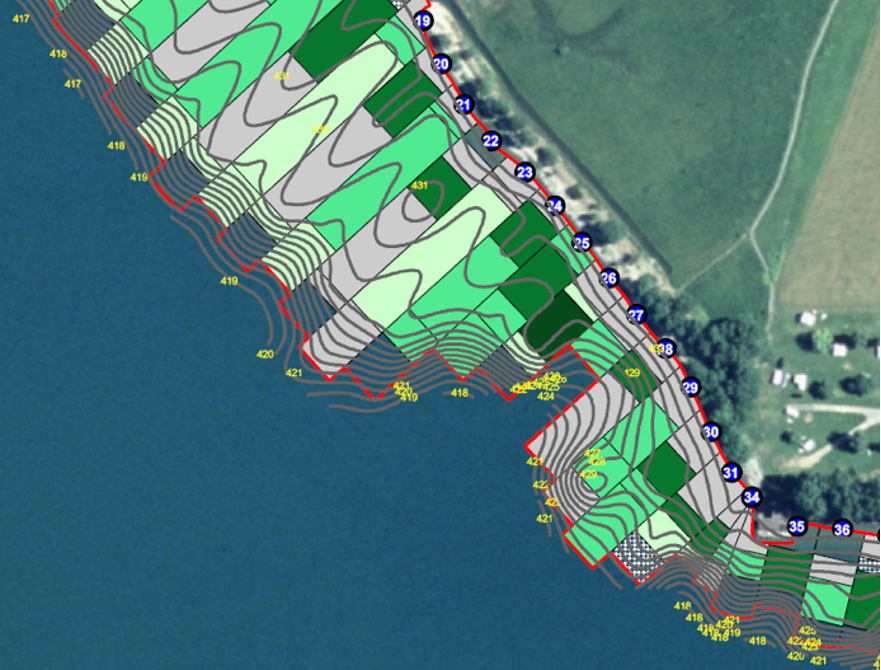 Die Datenerhebung erfolgt in der MS Access basierten Applikation. Projekt- und flächenbezogen werden die einzelnen Wasserpflanzenarten mit diversen Zusatzinformationen erfasst. Diese eingegeben Daten werden durch die Umsetzung geeigneter Schnittstellen mit Daten vom GIS (Höhenkurven, Polygone, Beschriftungen, …) ergänzt. Mit diversen Auswertungen, ebenfalls komplett in MS Access entwickelt, können diese Daten visualisiert werden (siehe 1. Abbildung). So erhält der Benutzer zum Beispiel einen Überblick der Verbreitung einer bestimmten Art, der Gefährdungsgrad von vorkommenden Arten, … – ein „Mini-GIS“ auf Basis MS Access.