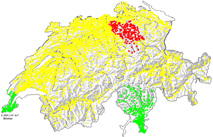 Die Georeferenzierung basiert in diesem Projekt auf den Koordinaten von Ortschaften (Abbildung 1). Dazu hat die Firma reByte GmbH einen kompletten Datenstamm erarbeitet, in welchem für alle Ortschaften die dazugehörigen Koordinaten hinterlegt sind. Zusätzlich wurden einzelne Ortschaften zu Regionen zusammengefasst, was die neue Möglichkeit eröffnet, Auswertungen auch für ganze Gebiete zu fahren (Abbildung 2).